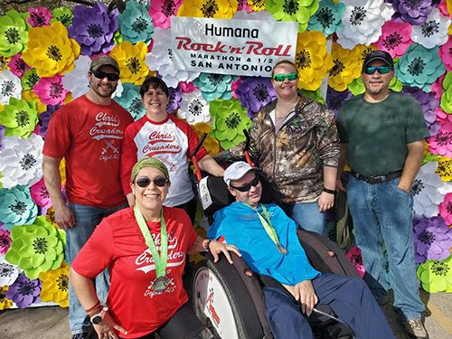 The foursome, which includes Chris’s wife Peggy, has traveled all sorts of roads together over the past 23 years. One they never would have predicted back in the days of honor societies and nights spent shooting darts together was on December 8, 2019, when Maria pushed Chris to the finish line of the Humana Rock ‘n’ Roll San Antonio Marathon. “Pushed” in the most literal sense, but Maria says it went both ways, “Having Chris in front of me was the inspiration I needed.”